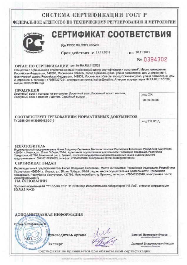 Классический Лоскутный Воск. В его состав входит пчелиный воск, живичный скипидар, прополис. (Для внутренних работ – стен, потолка, бани и т.д.) Лоскутный Воск с льняным маслом.(Полы, лестницы, мебель) Лоскутный Воск с льняным маслом и дегтем. (Для наружных работ – стены снаружи, фасады, террасы, беседки и т.д.)